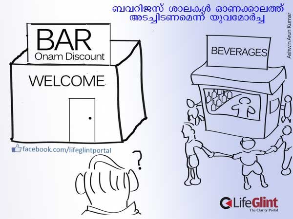 അത്തം മുതല് ചതയം വരെ ഓണക്കാലത്ത് സമ്പൂര്ണ മദ്യനിരോധനം ആവശ്യപ്പെട്ട് ബവറിജസ് കോര്പ്പറേഷന്റേയും കൺസ്യൂമർ ഫെഡിന്റേയും മദ്യവില്പ്പനശാലകള്ക്ക് മുന്നില് യുവമോര്ച്ച പ്രവര്ത്തകര് പ്രതിഷേധം നടത്തി. വില്പ്പനശാലകള് പ്രവര്ത്തകര് ബലമായി അടപ്പിക്കാന് ശ്രമിച്ചതിനെ തുടര്ന്ന് പലയിടത്തും പോലീസ് ബലപ്രയോഗം നടത്തി. പൊലീസ് കാവലിലാണ് വില്പ്പനശാലകള് പിന്നീട് തുറന്നു പ്രവർത്തിച്ചത്.
